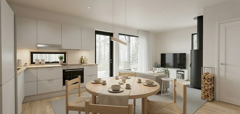 Muuttovalmiin talopaketin seinäelementit tehdään tehtaalla ja talo pystytetään päivässä –ei kastumisriskiä! Sisätyöt tehdään paikan päällä. Sisustus, kalustus ja valaistus toteutetaan toiveidesi mukaan.