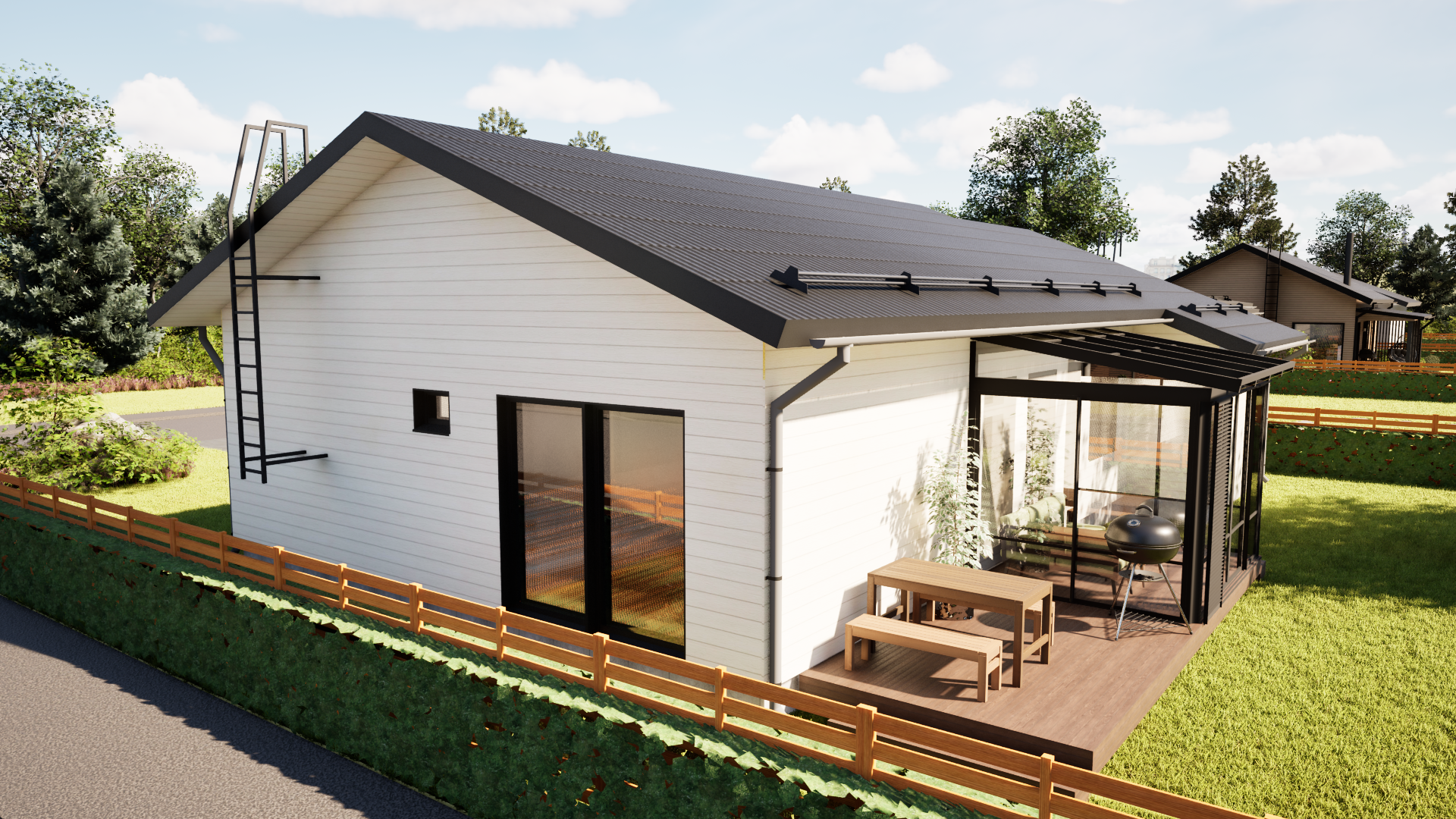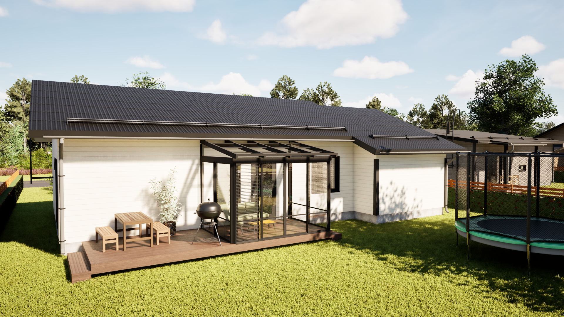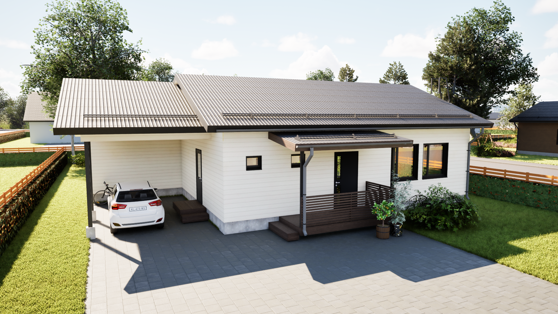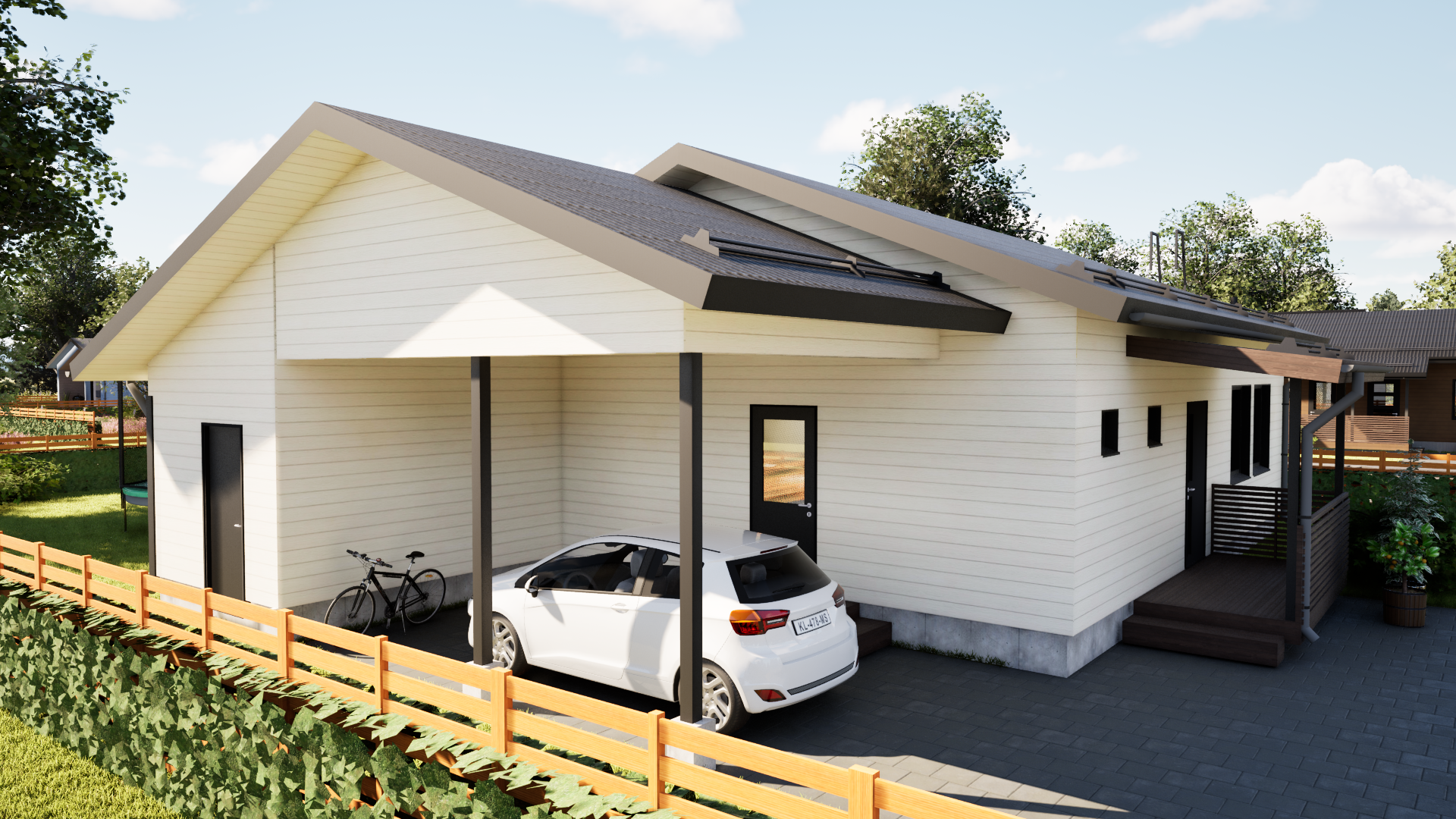 Taloon voi liittää terassin, pergolan, autotallin tai autokatos-varaston, yhdelle tai kahdelle autolle.