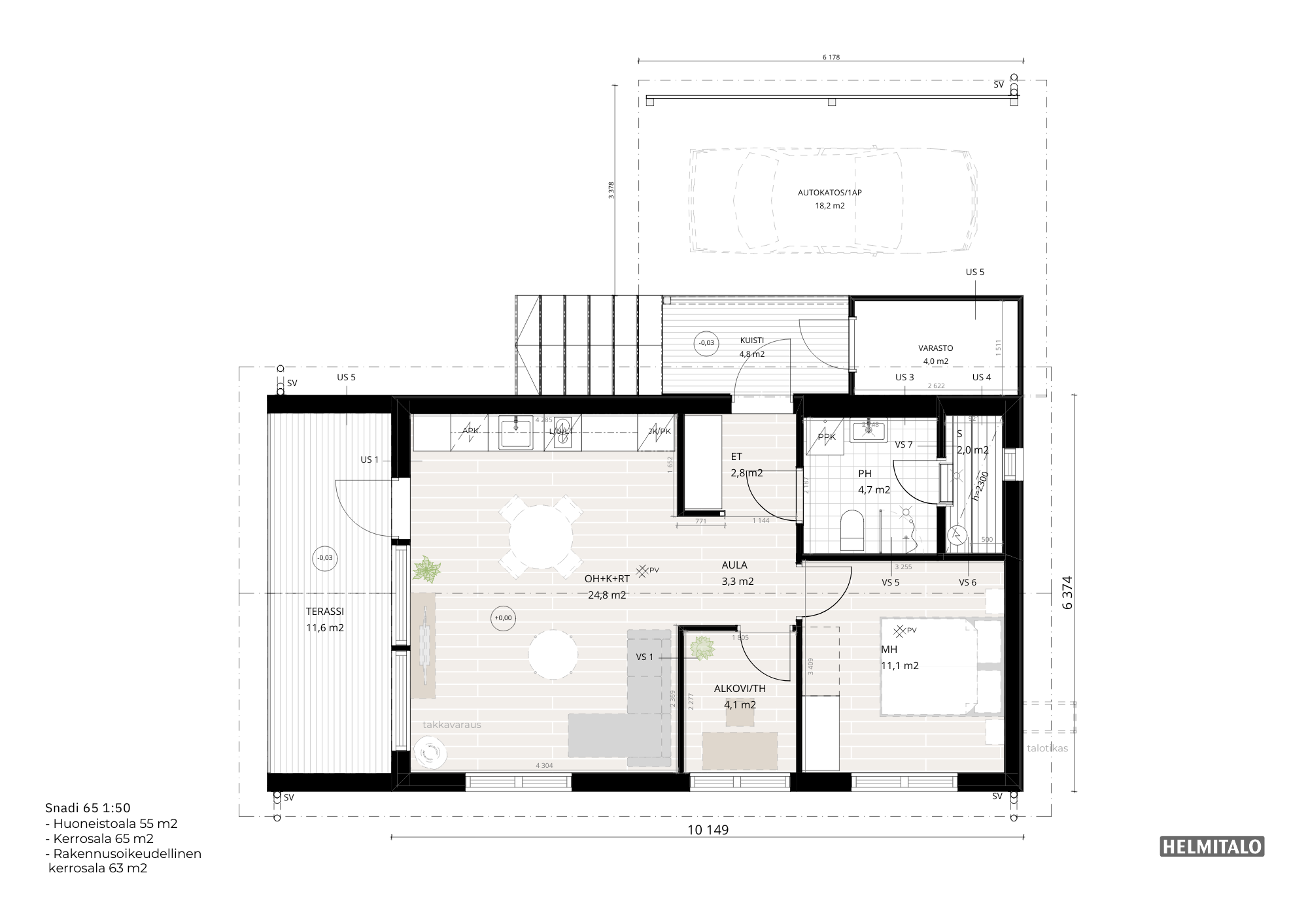 Snadihelmi 65 mahdollistaa asumisen oikeassa omakotitalossa, energiatehokkain asumiskustannuksin. Tämä on valinta sinulle, joka haluat kompaktimman kodin, mutta kuitenkin omakotitalo asumisen vapauden.
